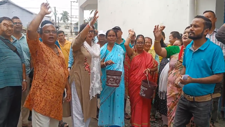 Bagdogra, 04th October: Residents from Lichu Bagan, Gadadhar Pally, Stalin Nagar, Ho-Chi-Min Nagar, and Rabindra Nagar protested with buckets in front of the Upper Bagdogra Gram Panchayat Office, demanding access to purified drinking water ahead of the upcoming Durga Puja celebrations.