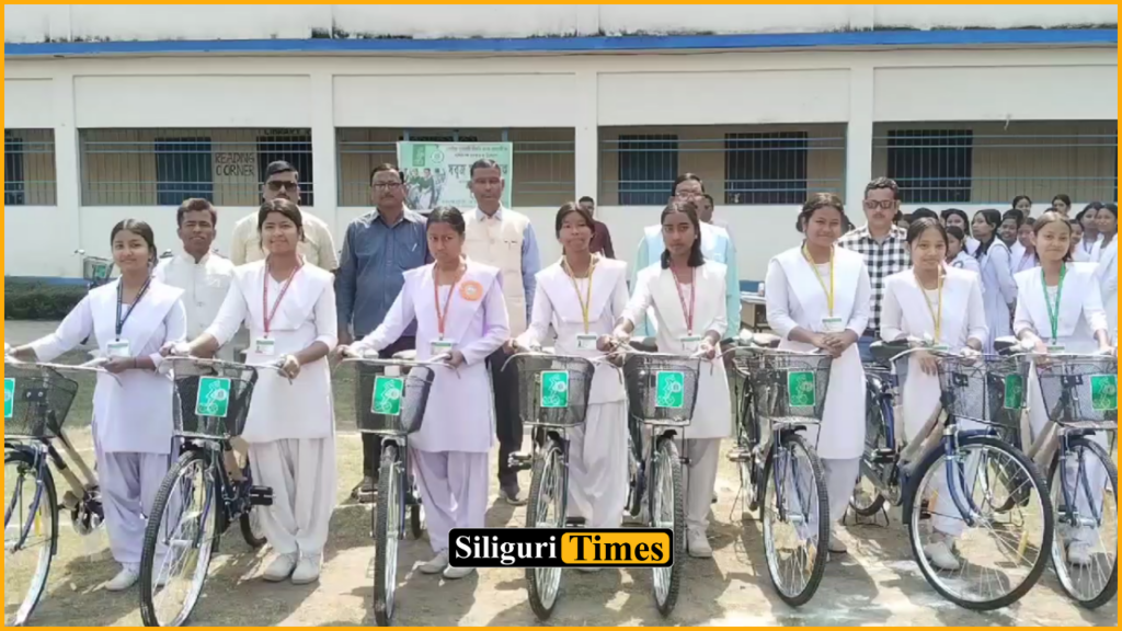 During a program on Tuesday, Binnaguri Gram Panchayat Pradhan Samijuddin Ahmed, along with the school’s Headmaster Pradeep Chaudhary, handed over bicycles to around 144 girl students.