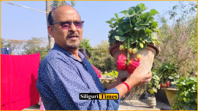 Rajganj, 21st February: Manojit Biswas, a teacher at Harihar High School and resident of Ambari’s Kamarvita in Binnaguri Gram Panchayat, has stunned everyone by cultivating strawberries weighing between 300 and 400 grams on the rooftop of his two-storey house.