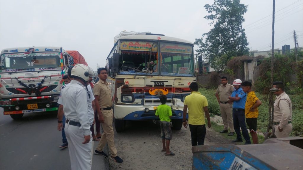 Fulbari, 22nd March: Sensation prevailed in the area after a passenger bus heading from Siliguri to Cooch Behar met with an accident in Fulbari. The incident surfaced from the Fulbari’s Jiaganj area of the Siliguri-Jalpaiguri National Highway. The bus lost control and hit a container standing in front of it and injured several passengers.