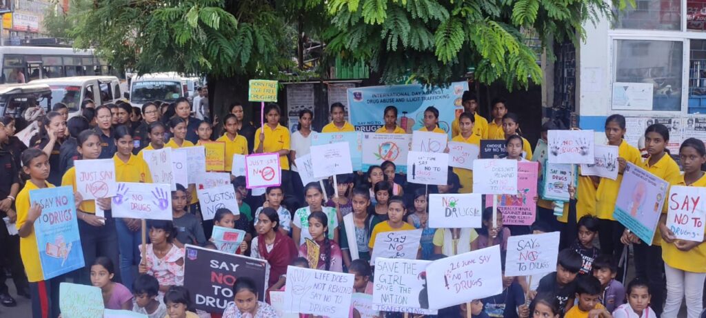 Siliguri, 26th June: A awareness program was organized on Monday at Hashmi Chowk, Siliguri, to mark the International Anti-Drug and Anti-Trafficking Day. The event was jointly organized by the Siliguri Woman Police Station and voluntary organizations such as Child In Need Institute (CINI), Gurukul, and Shakti Vahini.