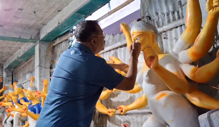 After performing the water offering in memory of his forefathers, Deputy Mayor Ranjan Sarkar proceeded to Kumartuli, where he conducted the ‘Chakshu Dan’ ceremony.