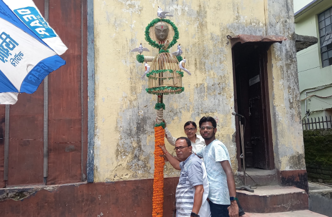 Siliguri, 21st July: The Sanghashree Club of Siliguri has commenced preparations for Durga Puja with the customary ‘Khutti Puja’. The club is known for unveiling a new theme annually to mesmerize city dwellers. This year marks the 58th anniversary with the unique theme of “Thakabo nako baddha ghare dekhaba ebar jagattake”.