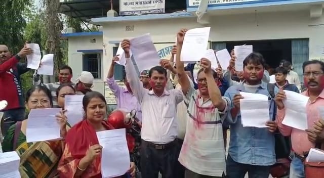 Today, about 100 teachers and employees of the Nikhilbanga Prathmik Shikshak Samiti responded to the show cause notice by playing Abir and distributing sweets in front of the inspector’s office of Belakoba Primary School, Rajganj.