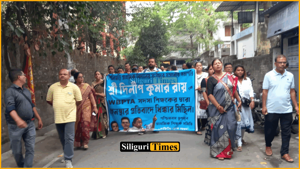 Siliguri, 22nd April: The West Bengal Trinamool Primary Teachers’ Association (WBTPTA) staged a protest rally in Siliguri demanding action against Trinamool Congress Councillor Ranjan Sil Sharma, who has been accused of harassing Dilip Kumar Roy, Chairman of the Primary School Council.