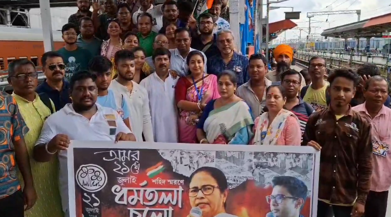 Siliguri, 19th July: Trinamool Congress (TMC) workers and supporters from Siliguri have departed for Kolkata to attend the Martyrs’ Day program on July 21. Among those leaving were women and youth workers, as well as Darjeeling District TMC President Papiya Ghosh, who traveled by the Haldibari Superfast Express from NJP station on Friday.