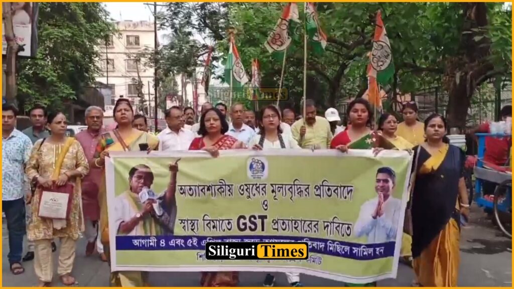 Siliguri, 05th April: A protest march was taken out by the Siliguri Town 2 Trinamool Congress Committee against the increased price of life-saving medicines and implementation of GST on health insurance premiums.