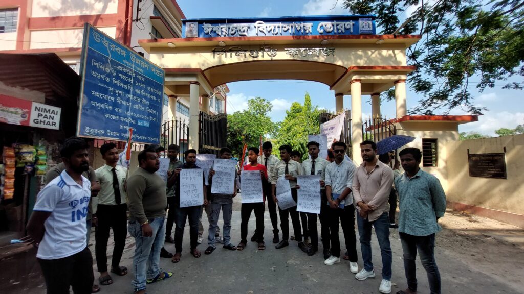 Siliguri, June 21: The ongoing allegations of corruption in NET and NEET exams have sparked outrage, leading to protests by the Trinamool Chhatra Parishad (TMCP) in front of Siliguri College earlier on Friday.