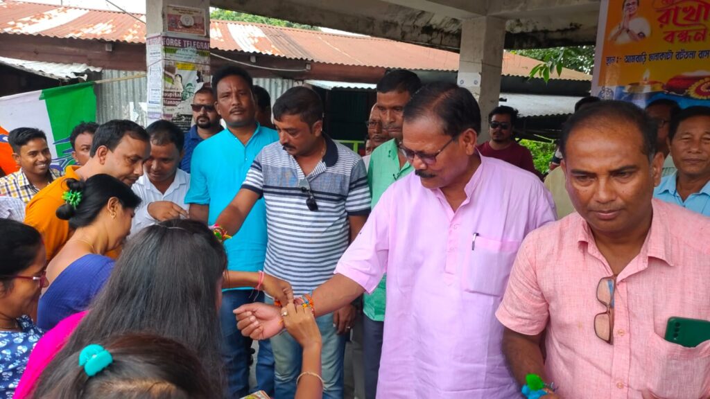 Rajganj, 30th August: On Wednesday, the members of the Trinamool Youth Congress (TMYC) of the Rajganj block joyfully celebrated the auspicious festival of Raksha Bandha with the shopkeepers and citizens of Rajganj. The celebration took place in the Ambari-Battala Junction of Binnaguri Gram Panchayat of Rajganj.