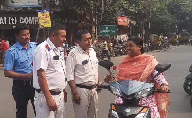 Siliguri, 29th January: In a unique awareness initiative, the Siliguri Metropolitan Police Traffic Department conducted a special operation, handing out roses to bikers without helmets instead of issuing challans.