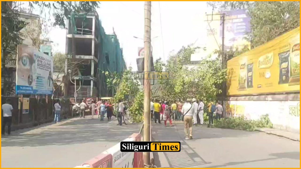 Siliguri, 17th March: A tree fell on a car on Bidhan Road near Hashmi Chowk in Siliguri, causing a major traffic disruption. Fortunately, the driver and pedestrians narrowly escaped without injuries.