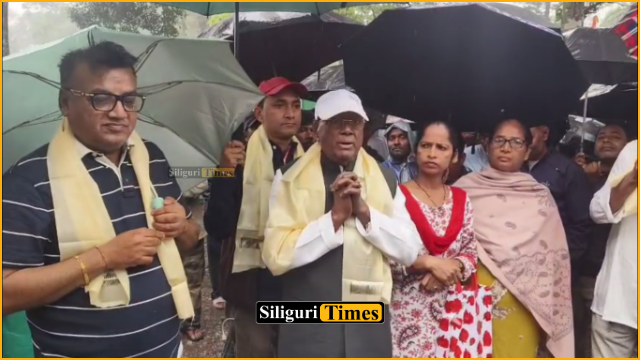 Bagdogra, 24th March: Ignoring persistent rainfall, Trinamool Congress candidate Sankar Malakar continued his election campaign with an umbrella at a tea garden in the area.