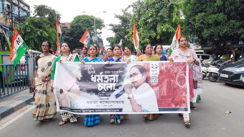 According to reports, the said rally commenced from Siliguri’s Mahatma Gandhi Chowk (Air View More) and concluded at Hashmi Chowk (Venus More), after circumambulating the busy Hill Cart Road. The rally was led by Darjeeling District Trinamool Congress President Papiya Ghosh, Darjeeling District Mahila Trinamool Congress President Milli Sinha, and other women members. Through the rally, the TMC women leaders gave a message to party workers regarding July 21 and urged them to go to Dharmatala.