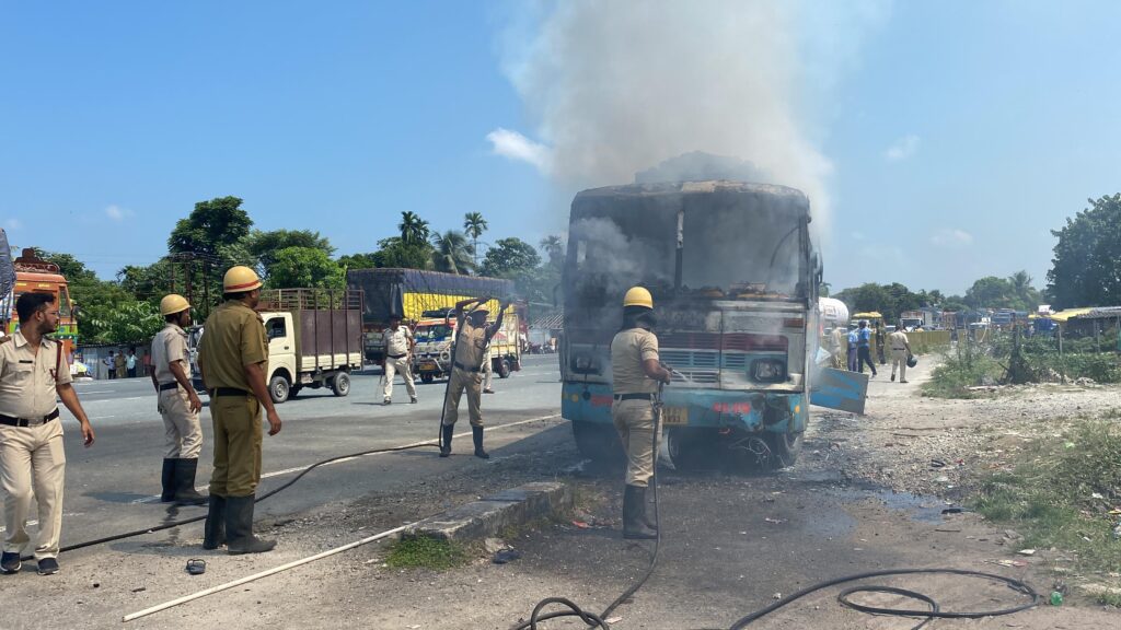 As per local sources, at around 11 a.m. on Thursday, a bus was heading towards Siliguri from Falakata, during which, it rammed into a scooty in the Bhutkihaat area. As a result, the two occupants of the scooter fell into the road and the two-wheeler was stuck under the bus. To evade the situation, the driver drove the bus further ahead. However, the locals initiated a chase and stopped the bus at Gandar More. The passengers evaded the bus fearing the prevailing situation. Subsequently, the agitated crowd vandalized the bus and set it on fire.