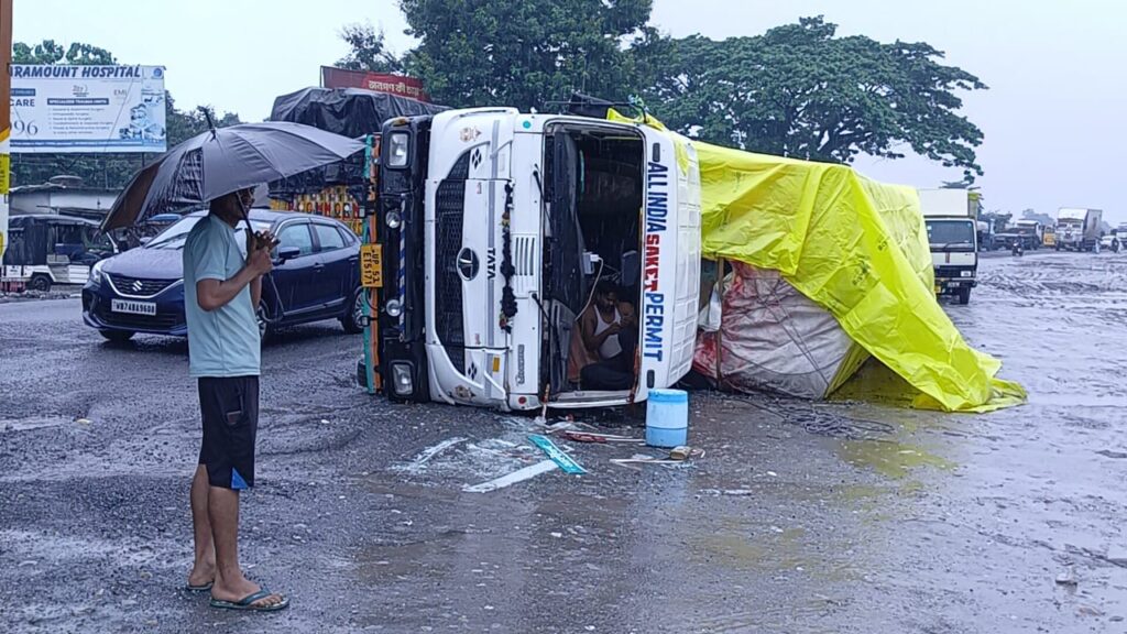 Fulbari, 10th July: A collision between two vehicles occurred early Wednesday morning on the Siliguri-Jalpaiguri National Highway (NH) at Jotiakali More, resulting in a goods-laden trailer overturning. Fortunately, no casualties were reported.