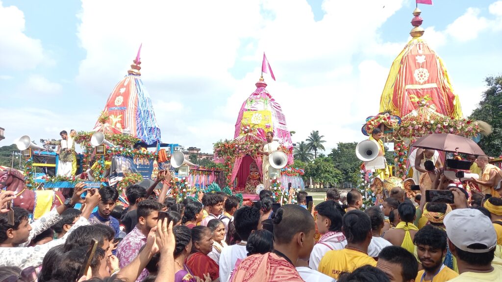 Siliguri, 15th July: The Ulta Rath Yatra was celebrated in Siliguri, marking the return of Lord Jagannath, Balaram, and Subhadra to the ISKCON temple from their aunt’s house. This year, the aunt’s house was set up at Suryanagar ground in Siliguri, where Puja and various events were held over seven days.