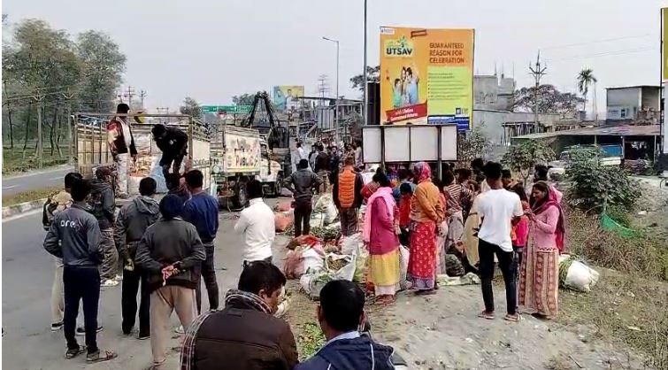 Kalchini, 17th February: An incident of road mishap surfaced where a vehicle loaded with vegetables lost control and overturned. The accident left four individuals injured. Meanwhile, after the incident, a crowd of people gathered to collect the vegetables.