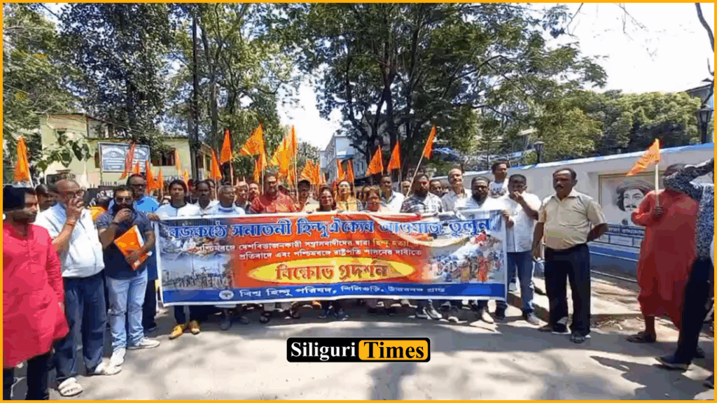 Siliguri, 19th April: Members of the Vishva Hindu Parishad staged a protest at Panitanki More in Siliguri on Saturday, demanding the imposition of President’s rule in West Bengal.