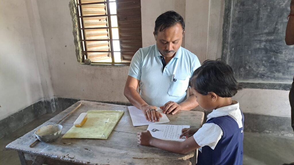 Subinoy Das began his teaching career at this school in 2011 when his vision was 75% impaired. Over the years, his condition has worsened, but his dedication to his work has only grown stronger. He currently teaches students in classes up to the fourth grade and is responsible for the first-grade students this academic session. Using Braille, Subinoy continues to educate with the full support of his students and colleagues.