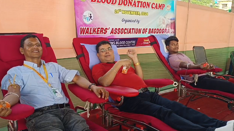 Bagdogra, 24th November: The Workers Association of Bagdogra organized a mega blood donation camp on Sunday, with the theme ‘Blood Donation is Life Donation.’ The camp was held at the Bagdogra Station More, where a significant response was received from the public.
